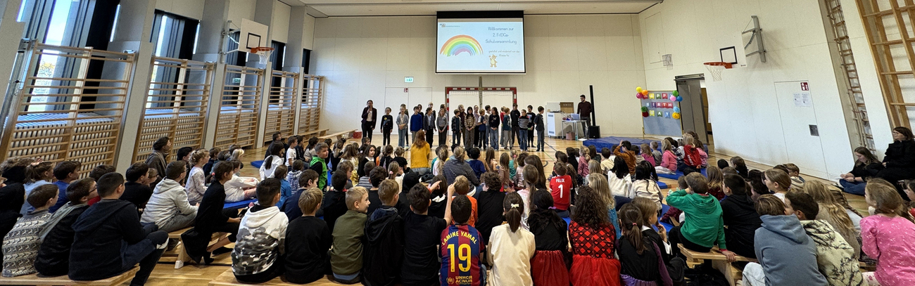 Die 4A gestaltete die zweite FrIDG-Schulversammlung im Oktober mit Lobrunde, Herzensangelegenheiten, Geburtstagsfeier, Quizauflösung, neuer Schätzfrage und dem Lied „Wir halten zusammen“.