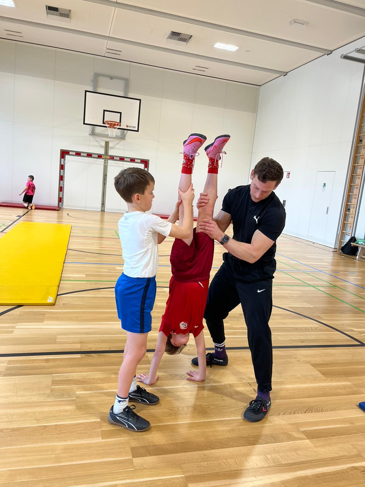 Zu Beginn zeigte Clemens gezielte Vorübungen zur Stärkung der Rumpfmuskulatur, die von den Kindern aufmerksam beobachtet und anschließend selbst ausprobiert wurden. Auch die Kräftigung der Handgelenke spielte eine wichtige Rolle, um den Körper optimal auf das Kopfübersein vorzubereiten.