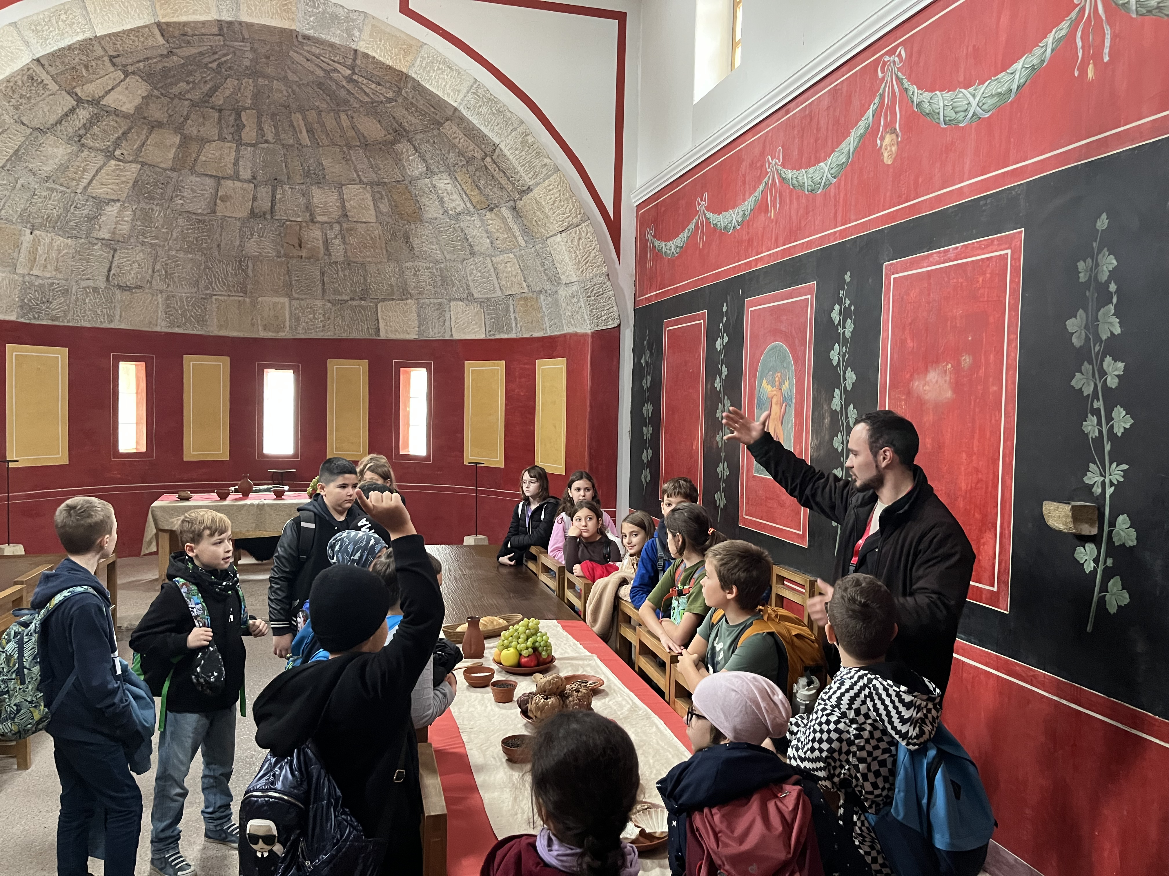 Bei einer kindgerechten Führung erfuhren die Schülerinnen und Schüler, wie römische Familien lebten, arbeiteten und feierten. Besonders beeindruckt waren viele von der römischen Fußbodenheizung und den prachtvollen Wandmalereien in den Wohnräumen. Im Badehaus wurde erklärt, wie wichtig Körperpflege und gemeinsame Zeit in den Thermen für die Römer waren – ein antikes „Wellnessprogramm“, das alle neugierig machte.