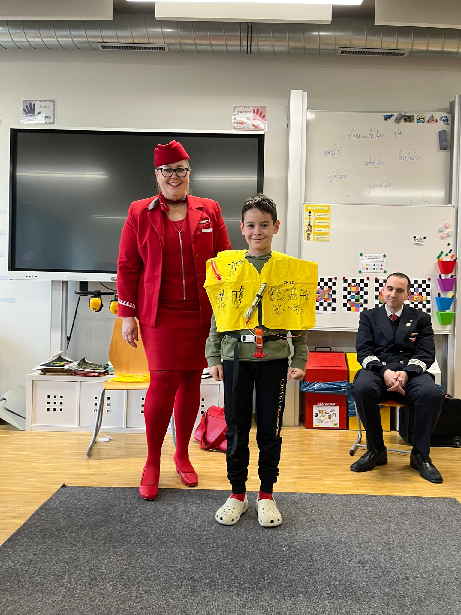 Besonders spannend war die Sicherheitsunterweisung: Die Kinder lernten, was bei einem Zwischenfall im Flugzeug zu beachten ist und welche Durchsagen an Bord gemacht werden. Ein Highlight war das Anprobieren einer echten Schwimmweste. So konnten die Schülerinnen und Schüler selbst ausprobieren, wie sich ein Teil der Sicherheitsausrüstung anfühlt.