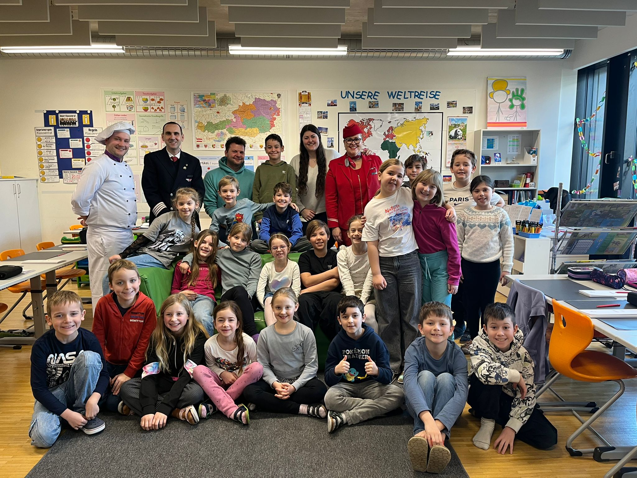 An einem besonderen Vormittag drehte sich in unserer Schule alles um das Thema Fliegen. Drei Gäste aus dem Flugdienst besuchten die Kinder und stellten ihre Berufe vor: die Flugbegleiterin Bettina Eigner, der Flying Chef Moritz Sturm und der Pilot Stefan Biegler.