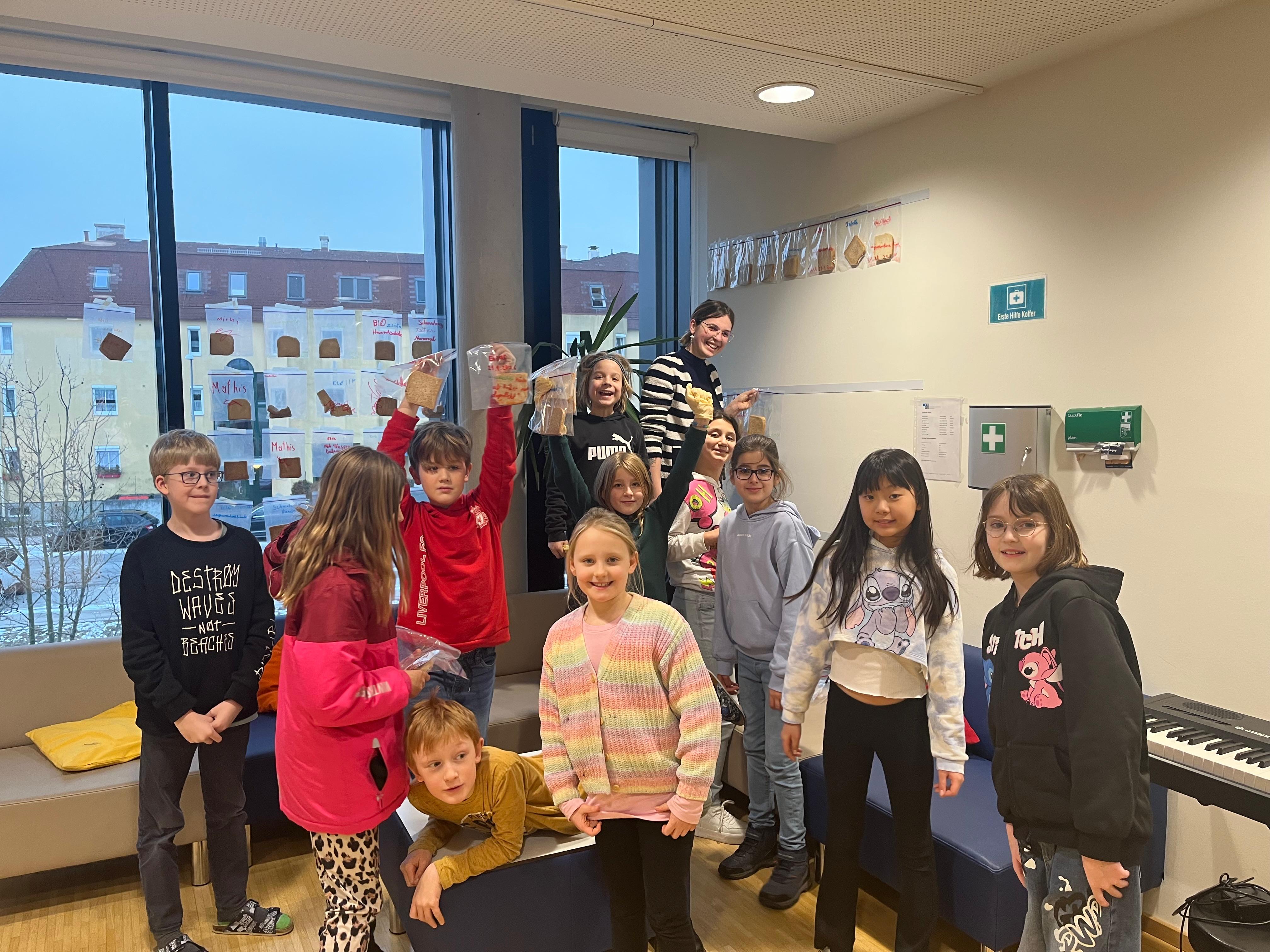 Ein besonderes Highlight war ein Experiment, bei dem jede Forscherin und jeder Forscher eine Brotscheibe auf Entdeckungsreise durchs Schulhaus schickte. Türen, Tische oder Fensterbänke – die Brotscheiben wurden vorsichtig über verschiedene Oberflächen gerieben. Anschließend kamen sie gut verschlossen in Zip-Sackerl und wurden an unterschiedlichen Orten gelagert: am Fenster, an der Wand oder in einer dunklen Kiste.
