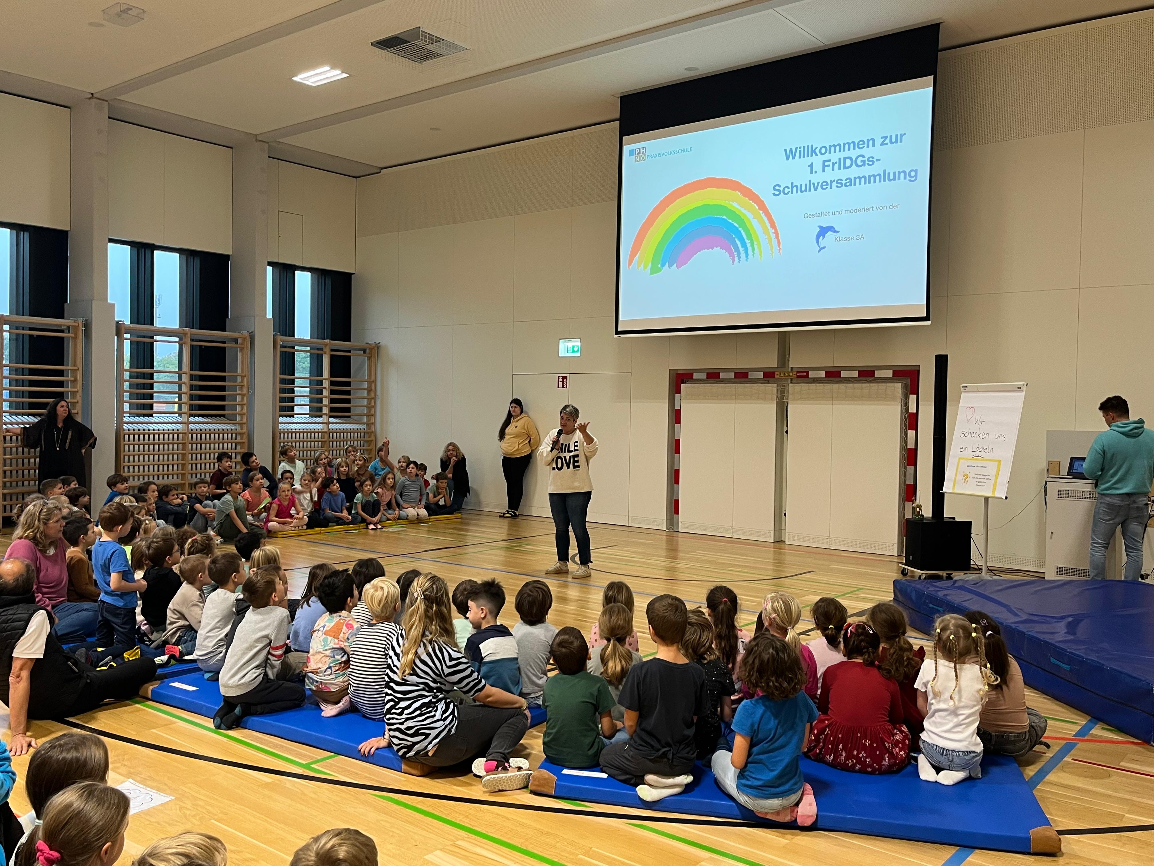 Am 26.09.2025 fand die erste FrIDGs-Schulversammlung in diesem Schuljahr statt. Die Schulversammlungen werden nun monatlich abgehalten und immer von einer anderen Klasse moderiert und gestaltet. Den Auftakt machte die Schülerinnen und Schüler der Klasse 3A. Unter dem Titel „Gemeinsam sind wir stark“ erlebte die Schulgemeinschaft ein abwechslungsreiches Programm, das den Zusammenhalt in den Mittelpunkt stellte.