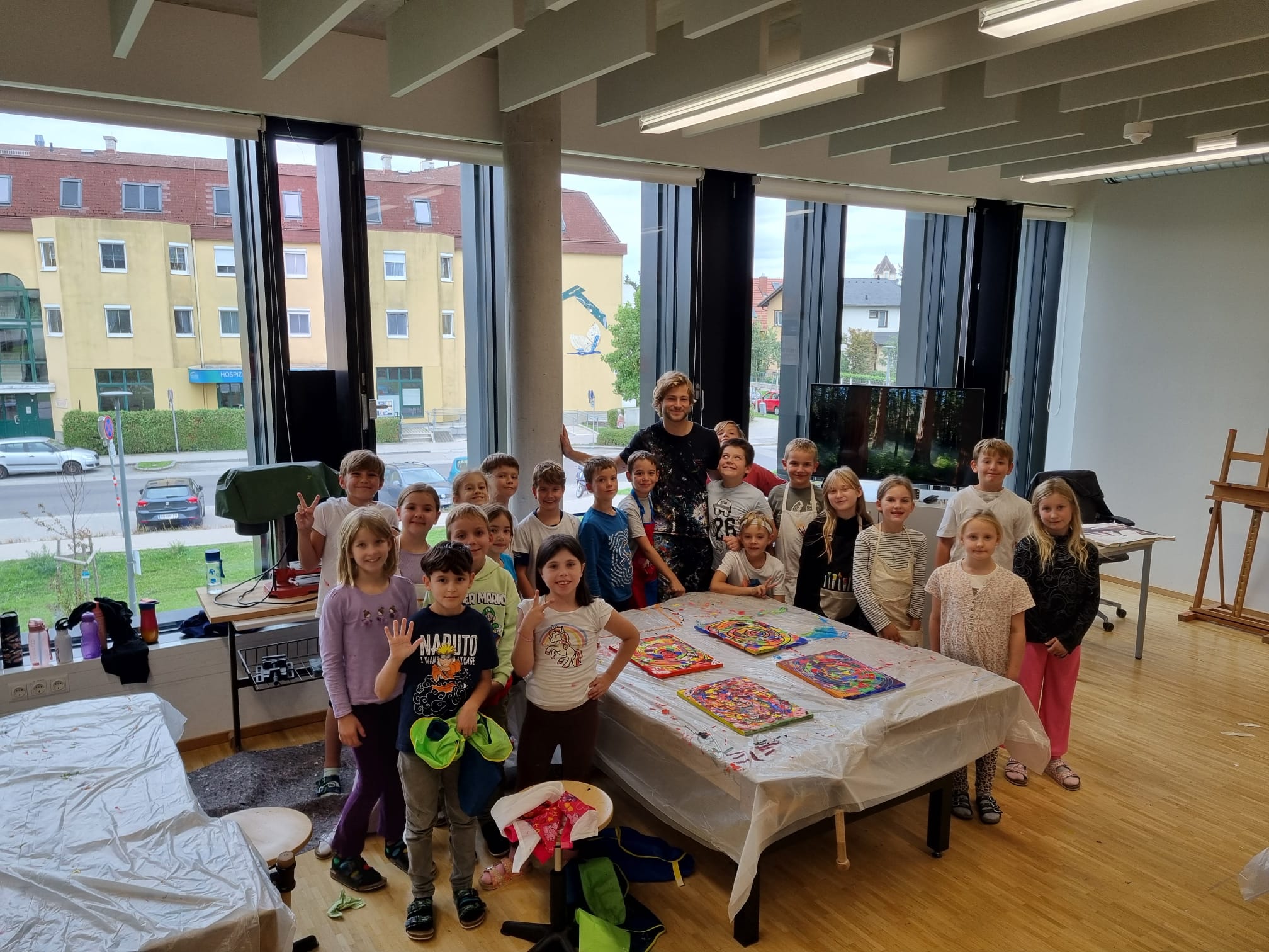 Beim Kunstworkshop erhielten die Kinder der Klasse 3A einen besonderen Einblick in die Welt von Friedensreich Hundertwasser. Der junge Künstler Max Flatischler zeigte ihnen, wie der berühmte Maler gearbeitet hat und erklärte die typischen Elemente seiner Werke.