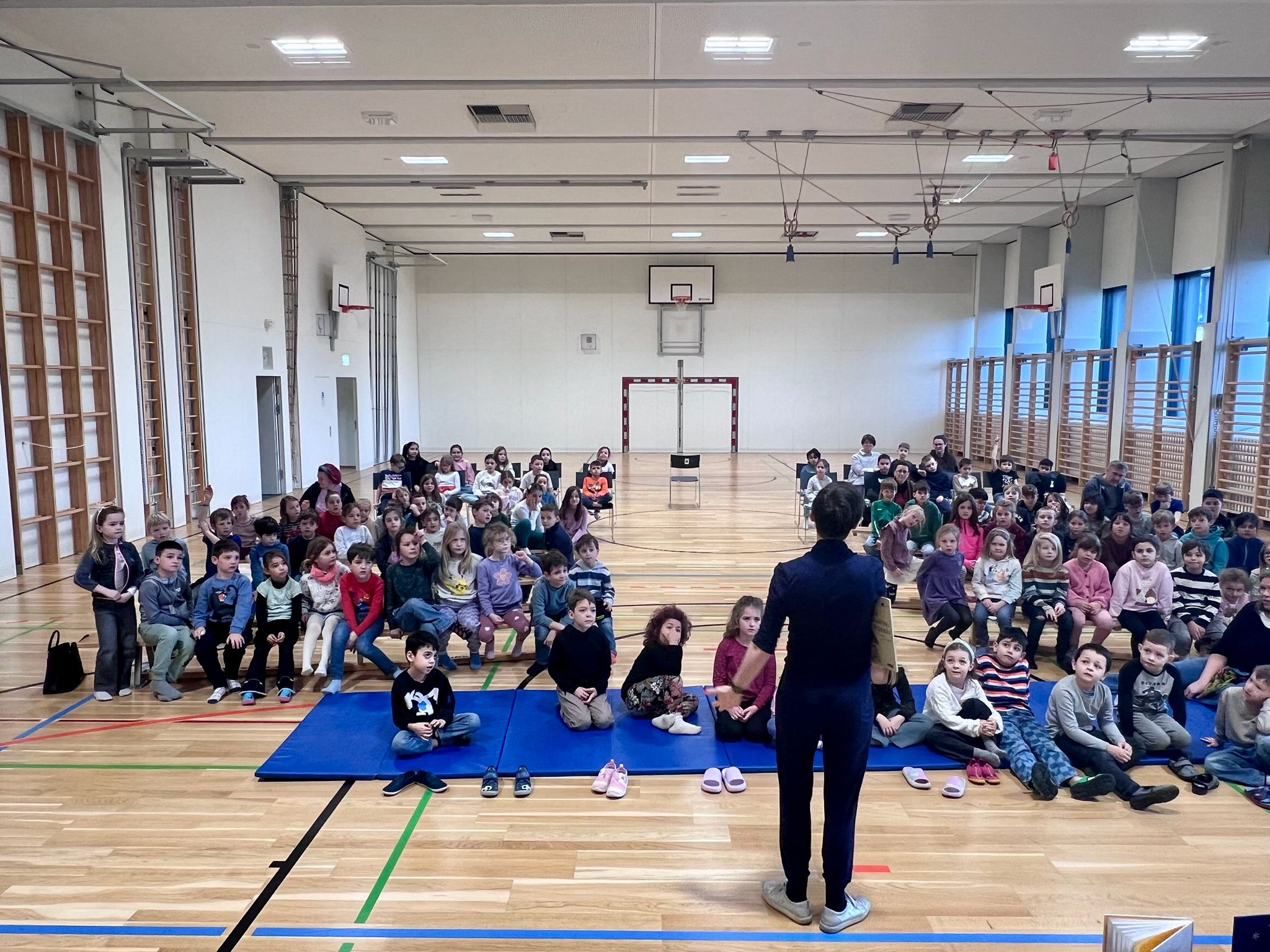 Danach wurde es richtig bewegt: Ein Gedicht über einen tanzenden Hund verwandelte die Lesung in eine kleine Mitmachshow. Alle Kinder und die Lehrpersonen durften mittanzen, hüpfen und sich zur Sprache bewegen. So wurde aus Literatur ein gemeinsames Körper- und Sprachspiel, das für viele strahlende Gesichter sorgte.