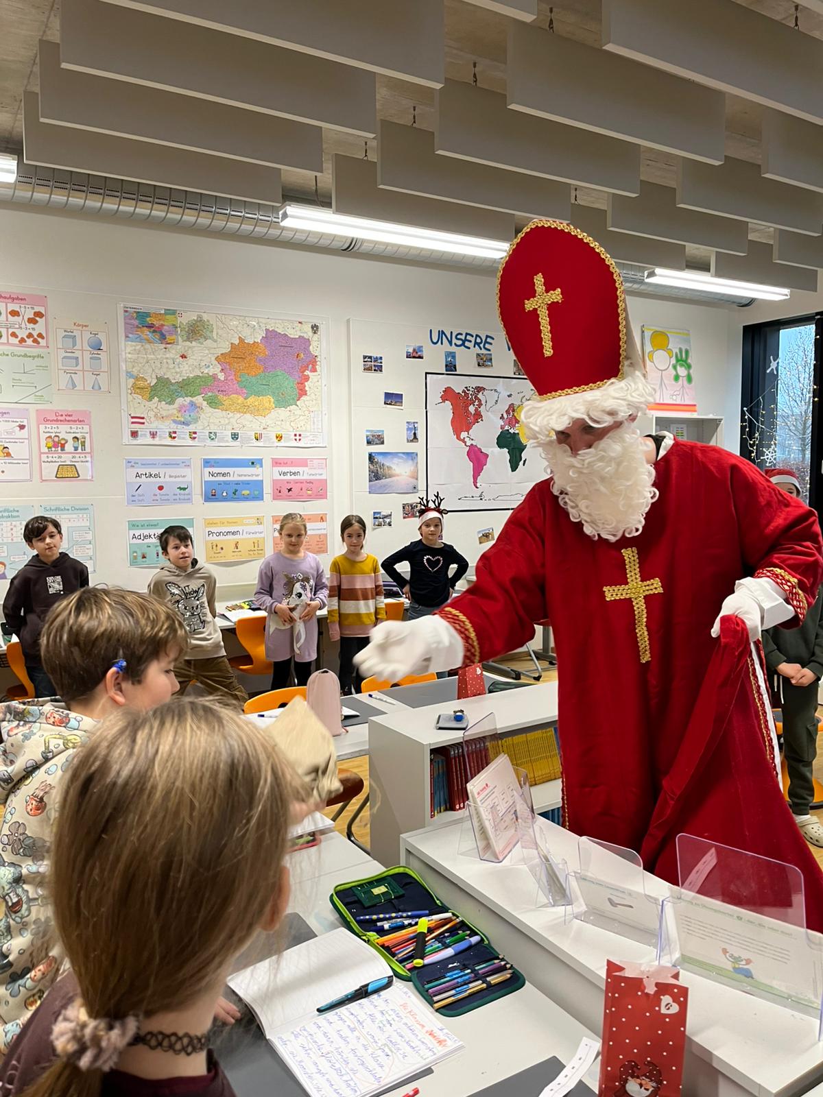 Mit viel Begeisterung präsentierten die Kinder dem Nikolaus Lieder, Gedichte und sogar eigene Raps für den hohen Besuch. Der Nikolaus hörte aufmerksam zu, lobte den Fleiß der Kinder und hatte für jede Klasse ein paar wertschätzende Worte im Gepäck.