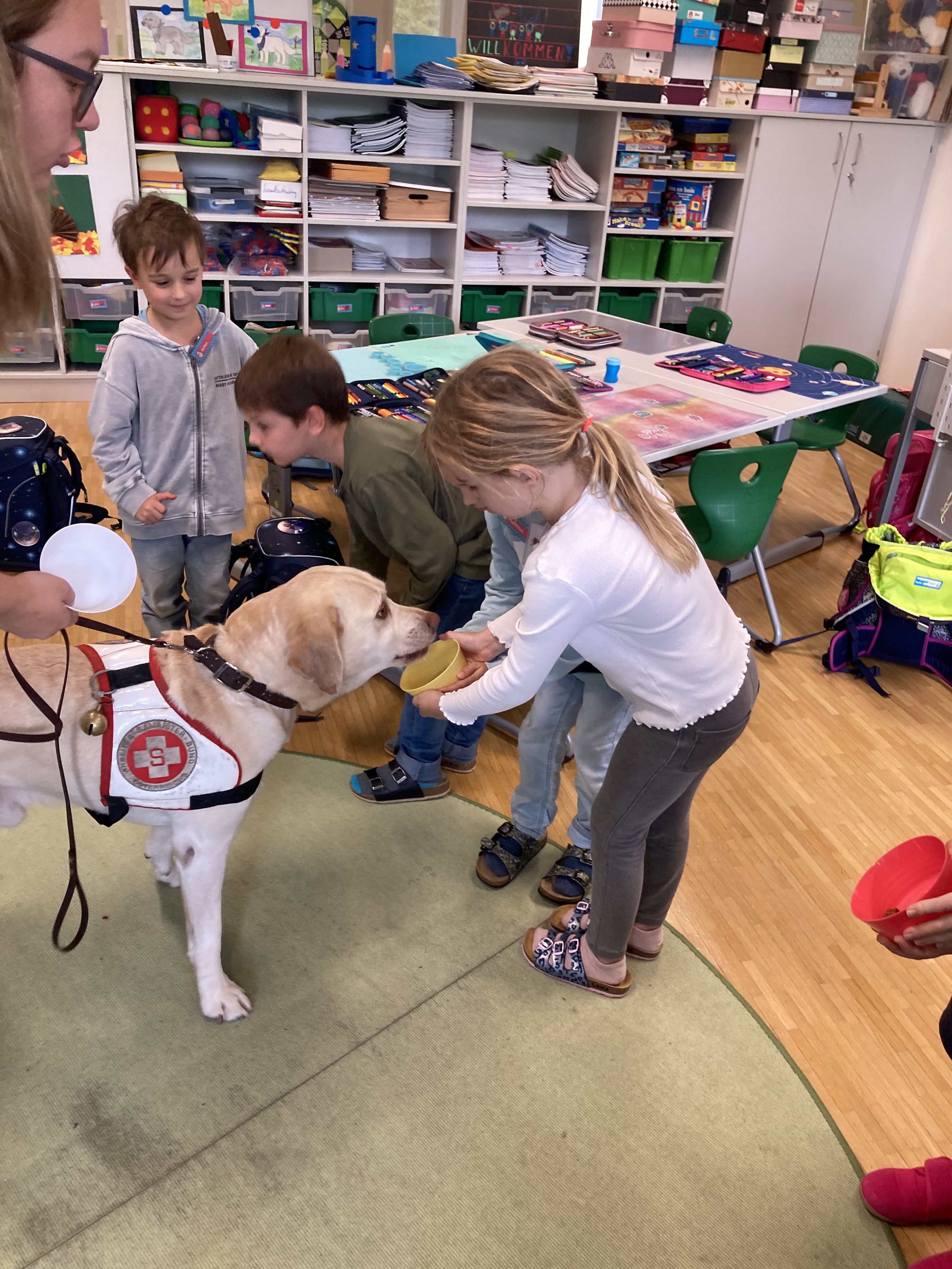 Die Kinder hörten gespannt zu und stellten viele Fragen rund um die Ausbildung und Arbeit eines Rettungshundes. Zum Abschluss durfte natürlich gestreichelt und gefüttert werden – Ray genoss die Aufmerksamkeit sichtlich!