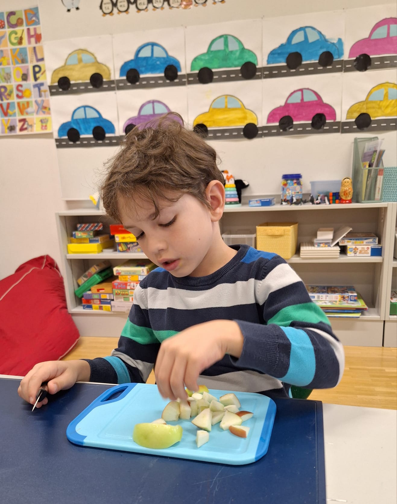 In der vierten Schulwoche drehte sich in der Vorschulklasse alles um das Thema Obst und Gemüse. Mit großem Eifer und Begeisterung erforschten die Kinder die Vielfalt der bunten Früchte – beim Obstrap, beim Sortieren von Obst und Gemüse und beim Drucken mit Apfelstempeln.