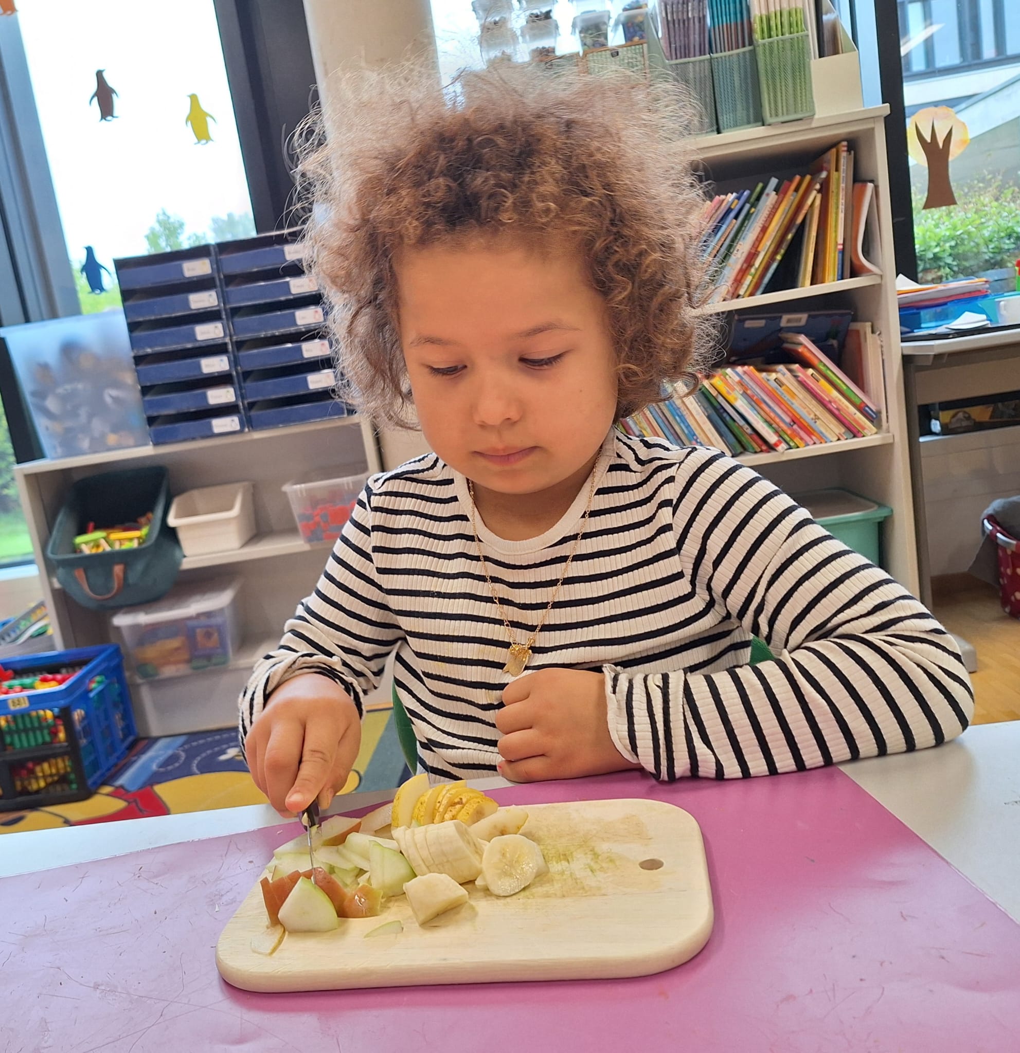 Ein besonderes Highlight war das Bilderbuchkino von Mira Lobe „Der Apfelbaum“, das die Kinder mit seiner liebevollen Geschichte begeisterte. Zum Abschluss wurde gemeinsam ein frischer Obstsalat zubereitet – eifrig schnitten die Kinder Bananen, Kiwis, Äpfel, Orangen und viele weitere Früchte. Mit großem Appetit genossen alle das gesunde Ergebnis ihrer Arbeit.