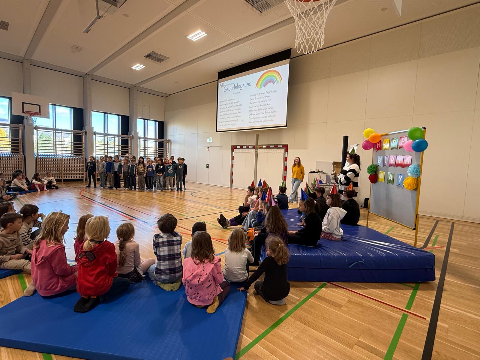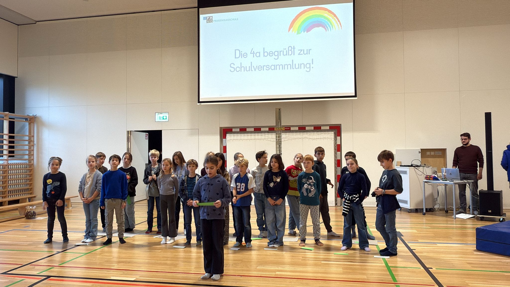 Am 24. Oktober übernahm die Klasse 4A Moderation und Gestaltung der zweiten FrIDG-Schulversammlung im Oktober. Wie bereits im September standen die bewährten Programmpunkte im Mittelpunkt: eine wertschätzende Lobrunde, Raum für Herzensangelegenheiten sowie das Feiern der Geburtstagskinder.